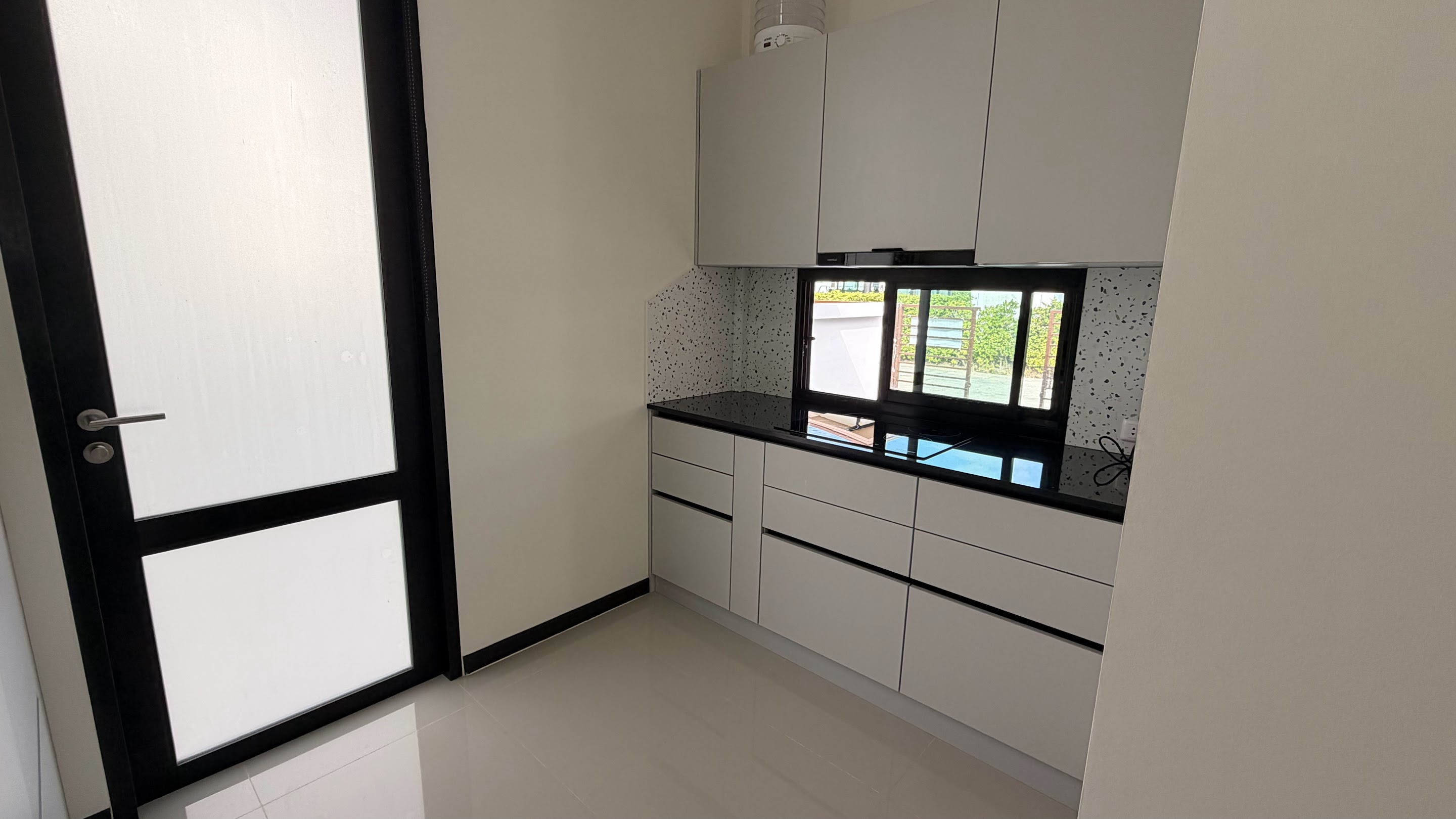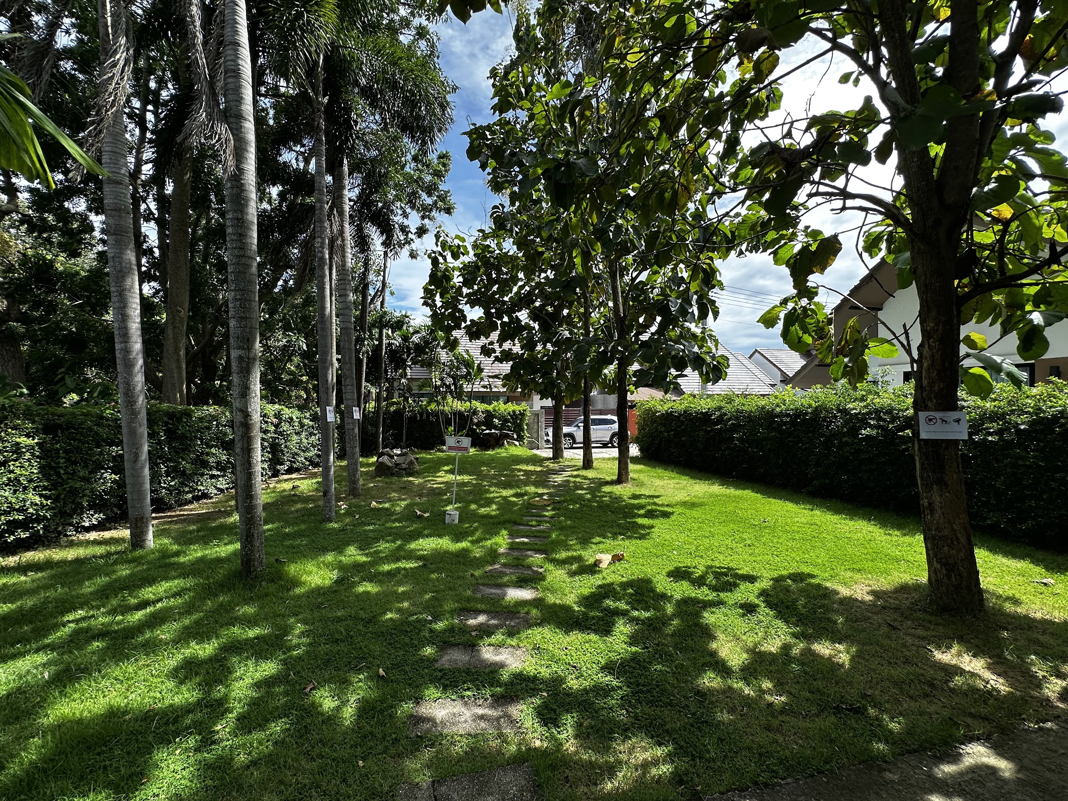 • The villa faces a tropical garden with palm trees